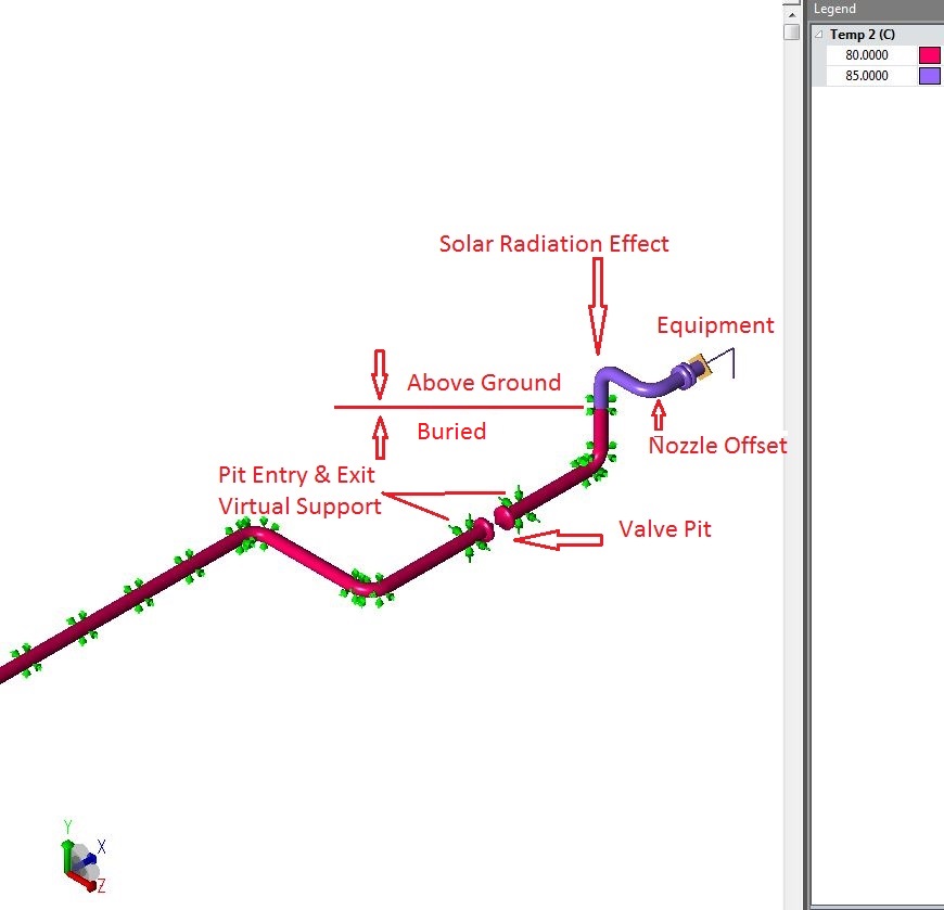 - b) Temperature. Normally design temperature design temperatures of buried portion and above ground are different so we should take care of that. If no such values are available then we must compare the design temperature (Td)) with solar radiation temperature (Ts). If value of Ts> Td then instead of Td we should put the Ts in calculation input file at above ground portion of pipe.